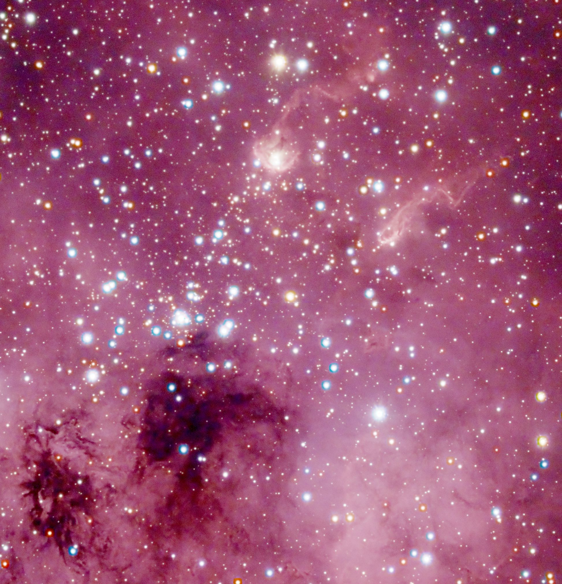 The Rosette Nebula is embedded in the open star cluster NGC 2244 (Caldwell 50) and was discovered in 1690 by John Flamsteed. Sh2-280 is the smaller nebula to the right of Rosette. It is probably part of the same nebula complex. This is an average of 160 one-minute exposures with the ASI 294 color camera and a 200mm Canon telephoto lens.