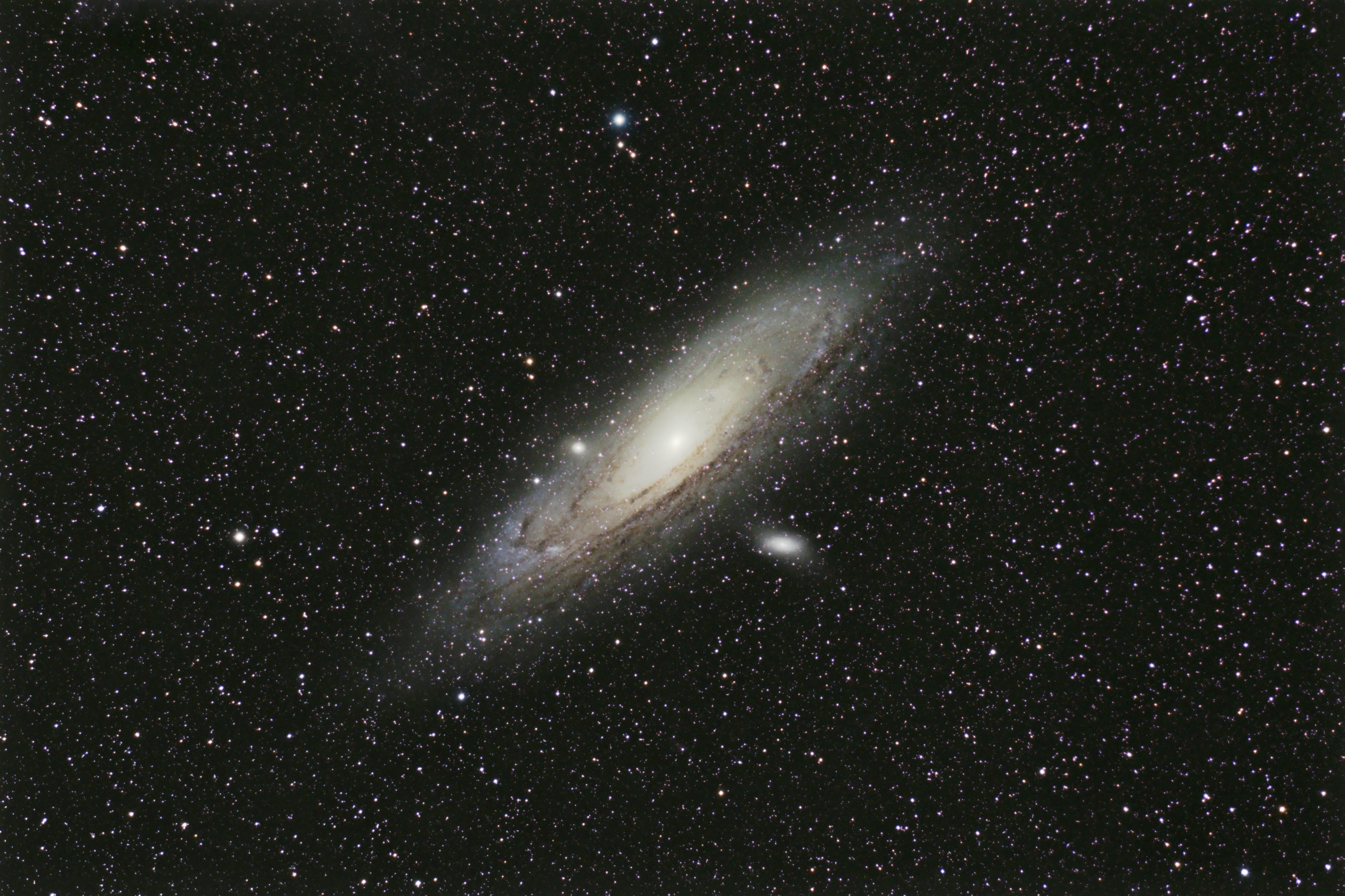 The Andromeda Galaxy and it's neighbor Triangulum Galaxy (Messier 33) are the most distant objects visible to the naked eye at 2.5 and 2.73 million light years from Earth respectively. Both are part of the local galaxy group. The Andromeda Galaxy is the closest major galaxy to the Milky Way and contains about one trillion stars, or roughly twice the number estimated for the Milky Way. You can also see two of the major satellite galaxies M32 and M110. On close inspection you will be able to identify many of the about 460 globular clusters assiciated with the Andromeda Galaxy. But the most massive cluster, Mayall II, is unfortunately outside of this field towards the lower left. This is an average of 159 one-minute exposures with the ASI 294 color camera and a 200mm Canon telephoto lens.
